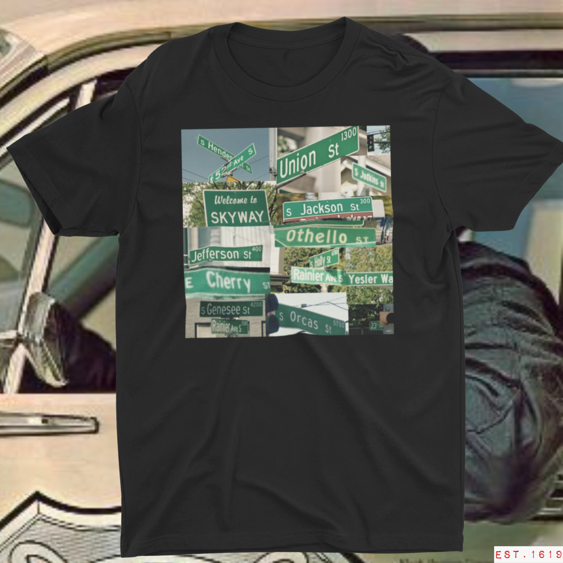 EST 1619 Presents: The #SeattleCity shirt. This shirt represents the infamous checkpoints (SkyWay, Henderson, Holly, Orcas, Othello, Jackson, Cherry, Yesler, Jefferson, Judkins & Genesee) along the much traveled #RainierAve and #23rd Ave. Limited edition shirt